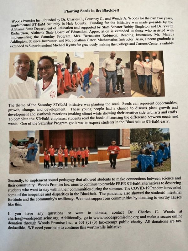 Our MISSION is to BUILD comprehensive programs through Woods Promise, Inc. and to increase the number of competitive minority and/or disadvantaged students pursuing STEM majors in college. The proposed evaluation plan will seek to measure the productivity of the STEM programs and support network to determine its impact on the preparation and matriculation of minority and/or disadvantaged students.